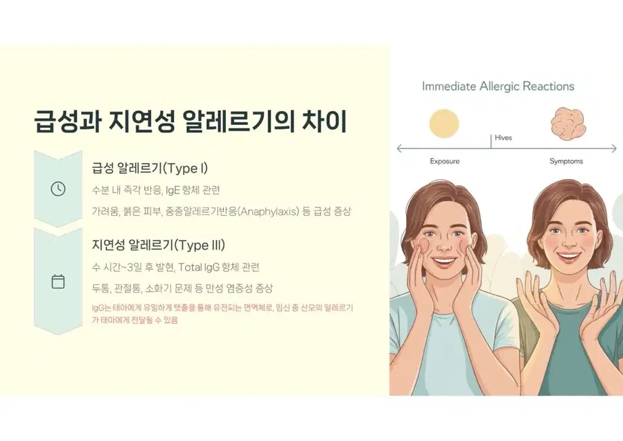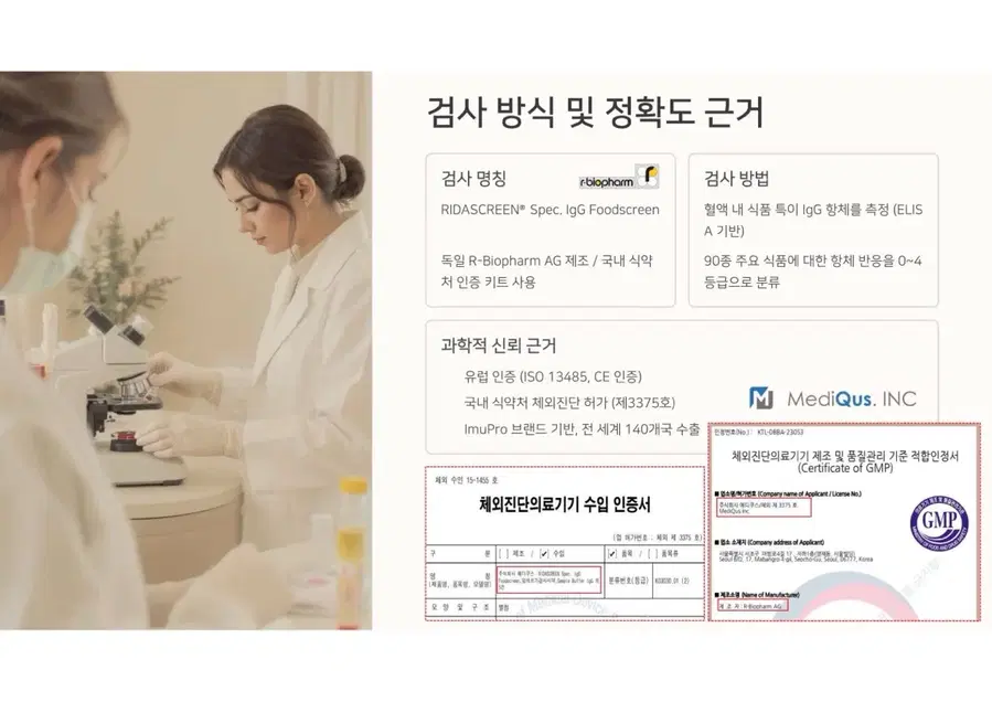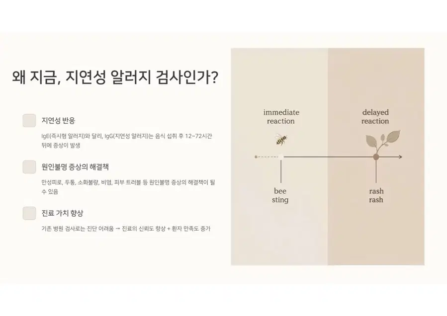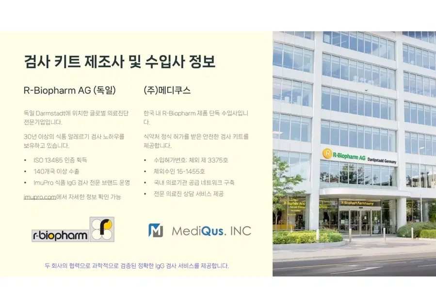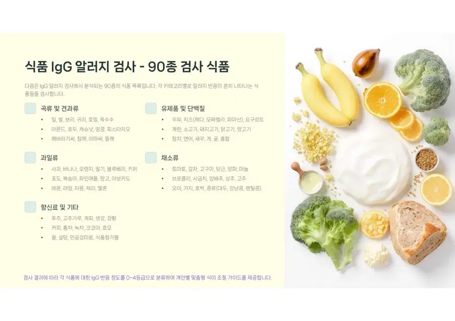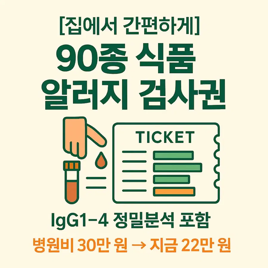 🧬 이 제품은 어떤 검사인가요? ‘지연성 알러지 검사’는 섭취 직후가 아닌, 수 시간~48시간 이후에 나타나는 피부 트러블, 복부팽만, 소화불량, 만성 피로, 두통 등의 원인을 IgG 면역 반응을 통해 분석하는 검사입니다. ❗ 기존 타사 제품, 이런 점이 문제였어요 ✔️ 90종 검사라고 해도, 대부분 IgG1만 검사 → IgG1만으로는 지연성 반응 전체를 판단하기 어렵고, → 위양성·위음성 결과가 많아 식단 개선에 실질적인 도움이 되지 않음 ✔️ 정확도 낮은 자체 검사실 또는 하청 검사 → 식약처 비허가 검사기관 사용 → 결과 리포트의 신뢰도와 비교 분석력이 떨어짐 ✔️ 리포트가 단순하거나 해석이 어려움 → 식품 등급은 나왔지만 식단 가이드가 없거나, 이해 어려움 🏅 우리는 다릅니다 — 차별 포인트 1. 병원 검사보다 더 정확한 IgG 분석 범위 일반 병원 알러지 검사의 대부분은 IgG1 항목만 검사하는 경우가 많습니다. 그러나 지연성 알러지는 IgG2~4 항체 반응에서도 흔히 나타나며, 이로 인해 피부 트러블, 만성 소화불량, 두통, 피로 등이 유발될 수 있습니다. 본 제품은 IgG1~4 항목 전체를 정밀하게 분석하여 보다 정확하고 세밀한 알러지 반응 파악이 가능합니다. 2. 해외 인증된 전문 검사기관에서 제조된 공식 키트 본 키트는 유럽 인증을 획득한 전문 검사기관에서 직접 제조 및 분석되는 공식 수입 정품입니다. 위탁 또는 자체 검사실에서 진행되는 일부 저가 제품과 달리, 제조부터 결과 리포트까지 국제 기준에 따라 일관성 있고 체계적으로 관리됩니다. 결과 리포트의 신뢰도, 분석력, 품질 면에서 확실한 차이를 경험하실 수 있습니다. 3. 단순 수치가 아닌, 실생활에 적용 가능한 식단 리포트 제공 일반 키트의 결과지는 수치만 보여주는 경우가 많아 “어떻게 식단을 바꿔야 하지?”라는 혼란을 줄 수 있습니다. 본 키트는 ✔ 음식별 회피 권장 ✔ 등급별 반응 요약 ✔ 식단 조절 가이드까지 포함되어 결과 리포트만으로도 바로 식생활 개선이 가능하도록 돕습니다. 4. 국내 단독 정식 수입 제품으로 품질·사후관리까지 안심 🔐 정식 단독 수입 제품입니다 본 키트는 국내 정식 등록된 독점 수입처를 통해 공급되는 제품으로, 검사기관, 리포트 구성, 사후 피드백 안내까지 일괄 관리되고 있는 공식 유통 제품입니다. 🛡️ 따라서 저가의 병행·유사 제품과는 품질, 결과 신뢰도, 사후관리 측면에서 확실한 차이가 있습니다. 검사 과정의 투명성은 물론, 구매 후에도 리포트 해석, 식단 상담, 사후 응대까지 브랜드가 직접 관리합니다. 유사한 이름의 병행 제품들과는 완전히 다른 등급의 제품입니다. 5. 임산부라면 반드시 알아야 할 지연성 알러지의 영향 IgG 항체는 유일하게 태반을 통과할 수 있는 면역항체입니다. 즉, 임산부의 알러지 반응은 태아에게 탯줄을 통해 직접 유전될 수 있습니다. 임신 중 식단에 포함된 특정 식품이 태아에게 영향을 주고, 향후 알러지 체질, 아토피, 피부 면역 반응에까지 연결될 수 있다는 연구 결과들이 있습니다. 따라서 임신 전후 알러지 검사는 단순히 엄마의 건강을 위한 선택이 아니라, 태아의 면역 체질을 위한 선제적 예방 조치가 될 수 있습니다. 📦 구성품 안내 채혈 키트 (자가 채혈 도구, 설명서 포함) 회수용 포장 박스 리포트 수령 안내지 검사 식품 리스트 및 등급표 설명서 💡 이런 분들께 추천합니다 피부 트러블이 반복되지만 원인을 몰랐던 분 특정 음식 후 소화가 잘 안 되거나 몸이 무거운 분 만성 피로, 두통, 잦은 복부팽만 등으로 고생하시는 분 자녀의 아토피, 알러지 증상이 궁금한 부모님 단순 다이어트가 아닌 체질에 맞는 식단을 원하시는 분 💰 판매 가격 안내 단품 구매: 22만 원 (병원 비급여 대비 실비처리 어려움, (95%불가), 약 8만 원 절감) 공동구매(10개 이상): 1개당 20만 원 병원에서는 동일 항목 검사 시 평균 28~30만 원 이상 발생하며, IgG1 항목만 검사