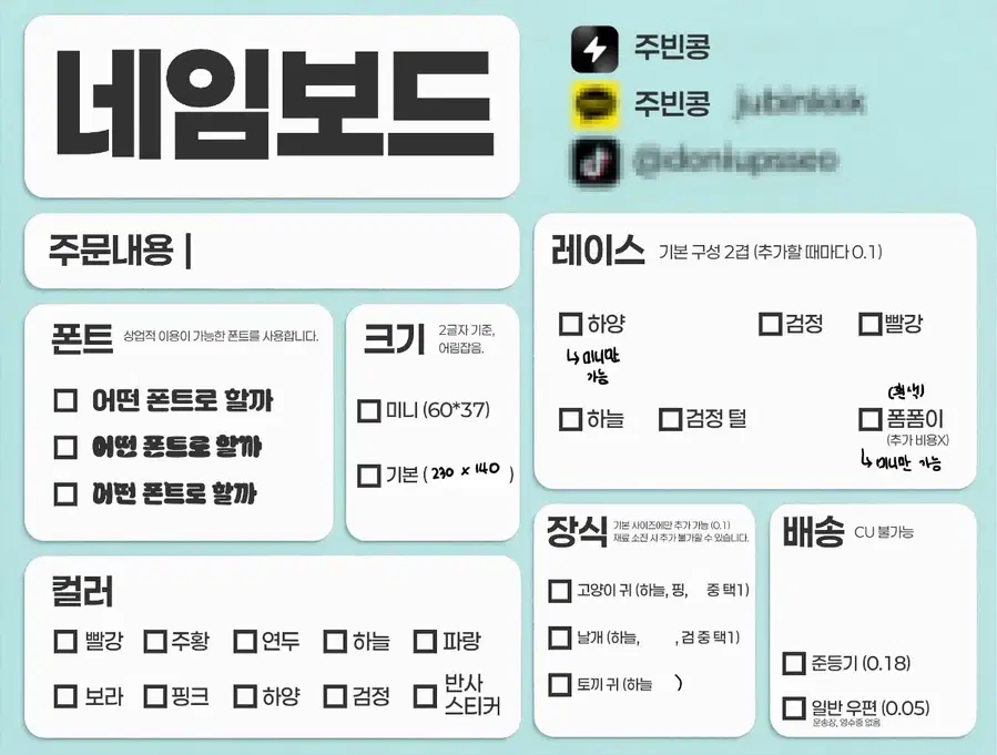 ✧ 네임보드 주문제작 커미션 -> 연예인, 캐릭터 모두 가능 -> 주문내용에 네임보드 제작할 이름 작성 -> 글 정독 후 맨 뒷장에 있는 신청표 작성하여 보내주시면 확인하고 결제창 만들어드립니다. 바로 결제하지 말아주세요. ► 미니 (뱃지 형태) 0.6 / 기본 1.4 ► 한국어 1~3글자 ► 마감기한 일주일 ► 월요일, 금요일 배송 ‼️ 사정이 생겨 당분간 GS25 일반택배와 반값택배가 불가능합니다. 🙇🏻불편을 드려 죄송합니다😭 ‼️